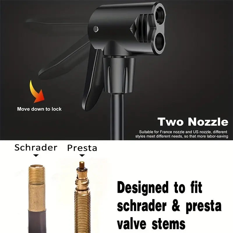 Built with a sturdy alloy base, this mini pump inflates up to 120 PSI and works with both Presta (French) and Schrader (American) valves. Compact enough to carry anywhere, it also includes needles for inflating sports balls and balloons.